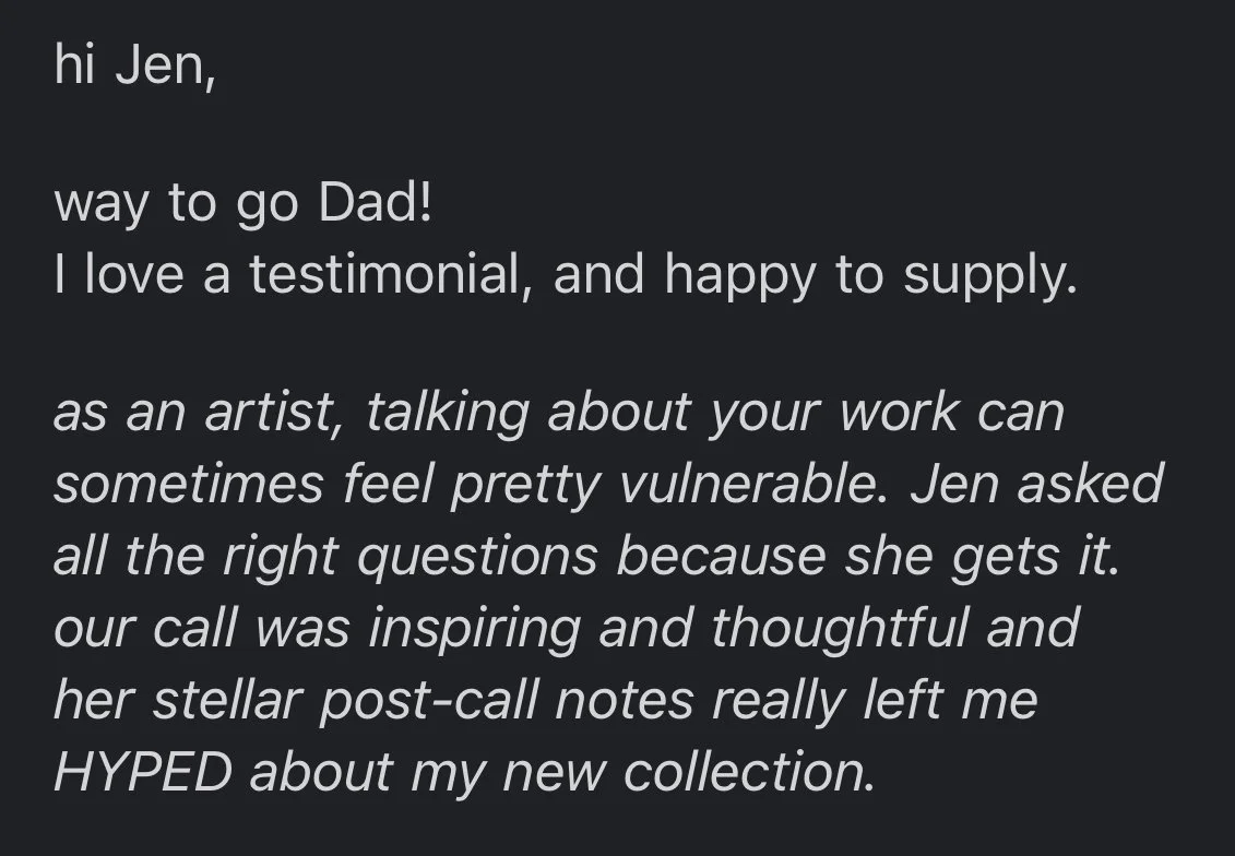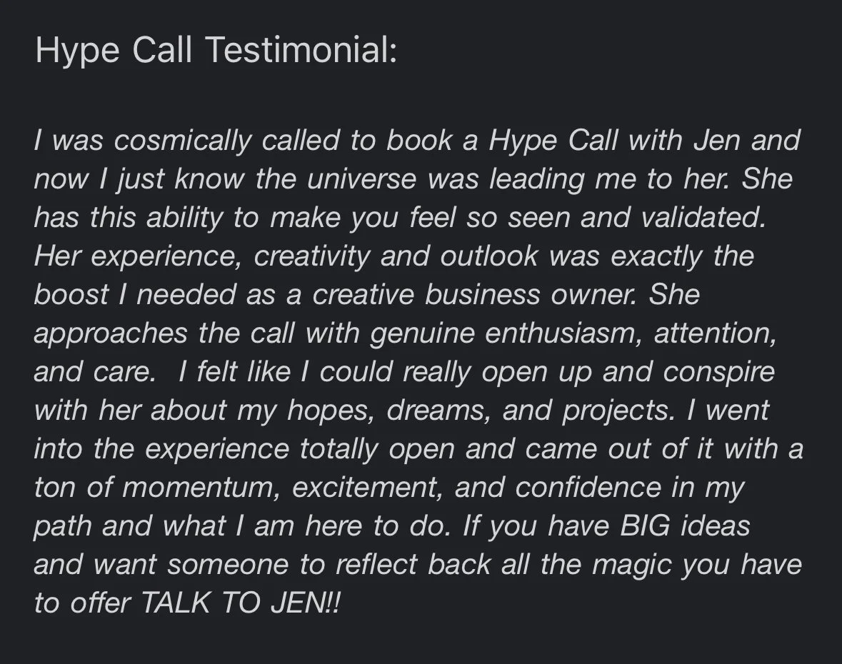 As a highly sensitive person who has relied on my creativity in all aspects of my life, I’ve come to deeply understand the power of having someone outside your circle believe in you. That kind of encouragement is so powerful and needed, and Hype Calls are just that. In these one-on-one conversations, I offer support and clarity while hyping you up in the process. Part pep talk, part strategy session, I bring real experience and genuine enthusiasm.