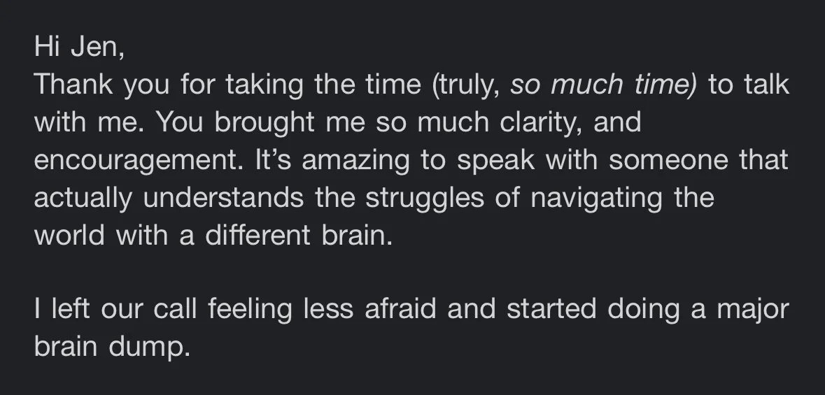 This isn’t just an hour-long chat. It’s a focused, supportive session designed to give you clarity, ideas,
